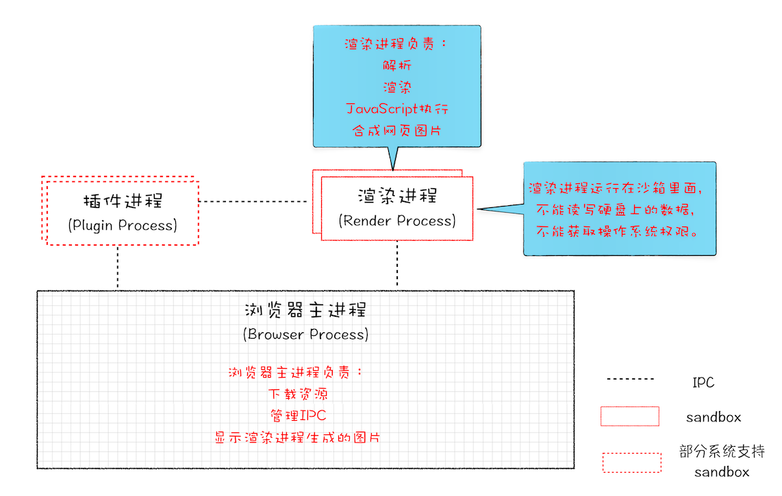 页面是运行在单独的渲染进程中的,同时页面里的插件也是运行在单独的插件进程之中,而进程之间是通过 IPC 机制进行通信(如图中虚线部分)。