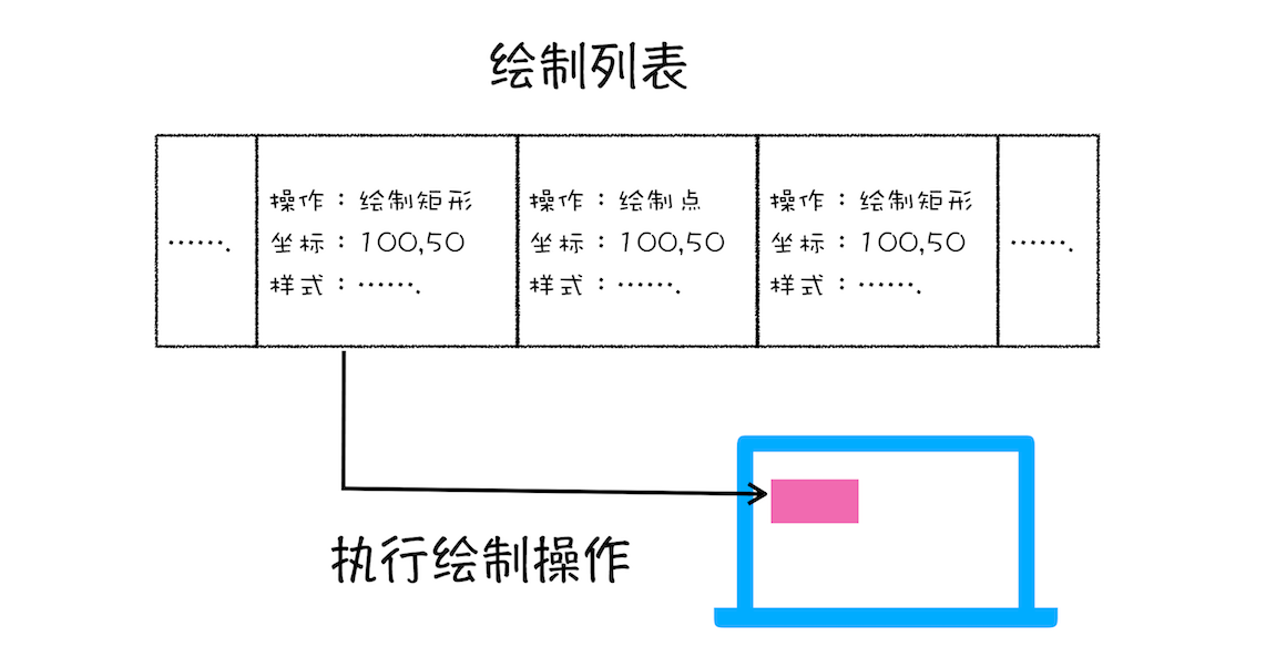 渲染引擎实现图层的绘制跟我们绘制canvas类似,会把一个图层的绘制拆分成很多小的绘制指令, 然后再把这些指令按照顺序组成一个待绘制列表,如下图所示: