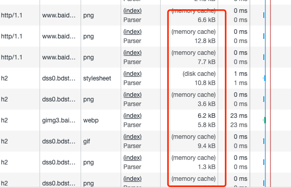 在Network面板中的size列表里,会看到两种标识:from memory cache 和 from disk cache 字样, 这就说明该资源来自缓存,memory cache 表示缓存来自内存,disk cache 表示缓存来自硬盘